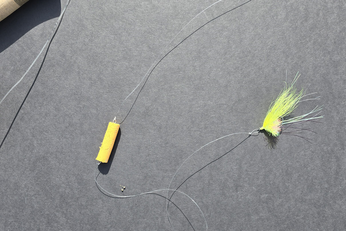 To get the line to roll over, 20 inches is the maximum leader length. The popper float tied into the leader acts as a hinge to transfer energy from the fly line to the fly.
